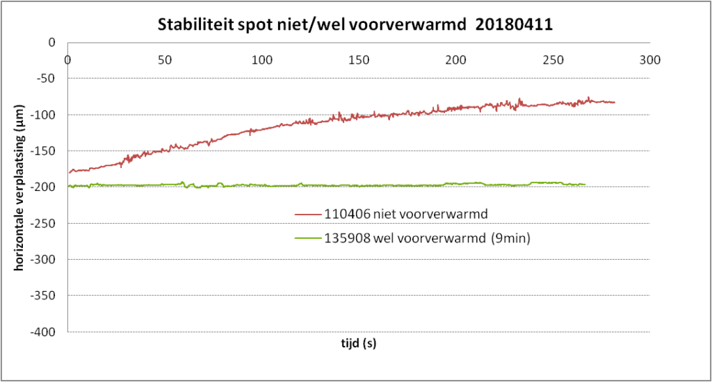 Registratie van spotbewegingen tijdens stilstand tonen dat dit niet het geval is. Na 300 seconden meten van de horizontale fluctuaties zijn er soms afwijkingen van bijna 100 micrometer!