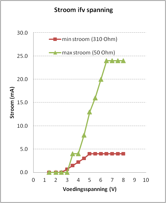 De stroom is maar onafhankelijk van de voedingsspanning als deze laatste een minimale waarde heeft. Uit onderstaande metingen blijkt dat de ingestelde stroom constant blijft als de voedingsspanning minstens 7V bedraagt: