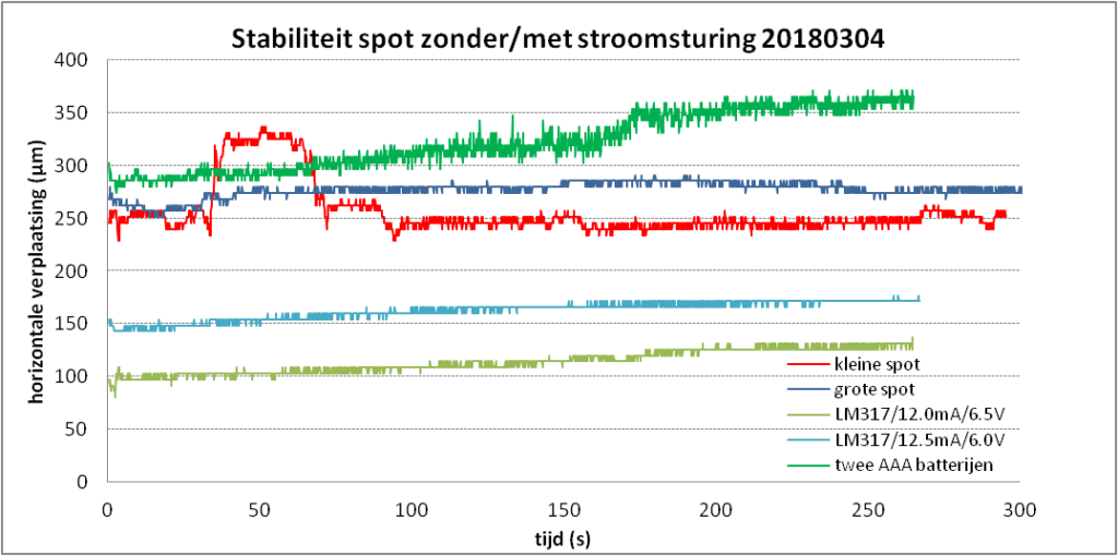 De onderste twee reeksen zijn gemaakt via de LM317-schakeling. Op korte termijn is er enkel nog de variatie van plus of min één pixel; op langere termijn is er een stelselmatig verloop (25µm op 250 seconden).