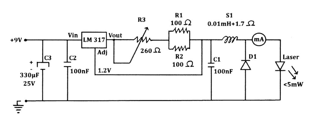 De weerstanden R1 en R2 bepalen de maximale stroom die door de schakeling kan lopen. Potentiometer R3 laat toe de stroom door de laser traploos te regelen tussen 4 en 24mA. Op de ingang van de stroomsturing staat een elco C3 (capaciteit in de orde van microFarads) om fluctuaties in de voedingsspanning af te vlakken. Een diode D1 parallel op de laserdiode maar in de sperrichting aangesloten dient om mogelijke tegen-emk’s op te vangen zodat de laser hier niet door belast wordt. Een smoorspoel S1 in serie met de laser kan stroompiekjes opvangen, geinduceerd in het circuit door uitwendige oorzaken (bvb schakelaar opzetten) De twee kleine condensators C1 en C2 dienen ook voor verdere ontstoring.