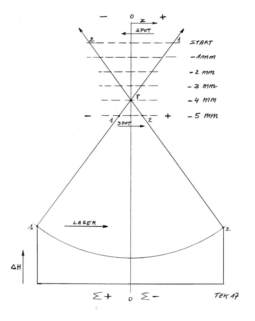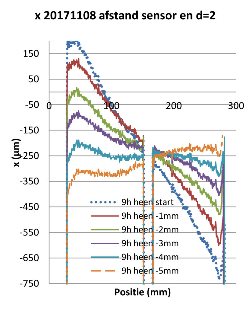 Bij aanvang van de test staat de sensor (stippellijn) in positie “Start”. Dat is een heel eind verder van de testspiegel dan het brandpunt F. Hierdoor loopt de spot van rechts naar links over de sensor (van nummer 1 naar nummer 2). Hierdoor heeft x in aanvang een hoge positieve waarde, evolueert over nul naar een hoge negatieve waarde (zie grafiek hieronder x 20171108 lijn 9h heen start)